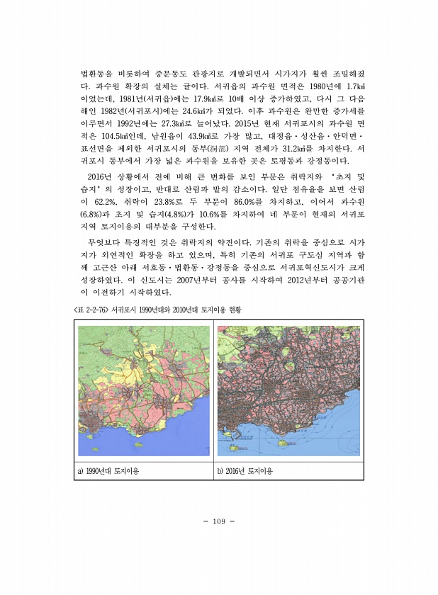 109 법환동을 비롯하여 중문동도 관광지로 개발되면서 시가지가 훨씬 조밀해졌 다. 과수원 확장의 실체는 귤이다. 서귀읍의 과수원 면적은 1980년에 1.7㎢ 이었는데, 1981년 서귀읍 에는 17.9㎢로 10배 이상 증가하였고, 다시 그 다음 해인 1982년 서귀포시 에는 24.6㎢가 되었다. 이후 과수원은 완만한 증가세를 이루면서 1992년에는 27.3㎢로 늘어났다. 2015년 현재 서귀포시의 과수원 면 적은 104.5㎢인데, 남원읍이 43.9㎢로 가장 많고, 대정읍?성산읍?안덕면? 표선면을 제외한 서귀포시의 동부 洞部 지역 전체가 31.2㎢를 차지한다. 서 귀포시 동부에서 가장 넓은 과수원을 보유한 곳은 토평동과 강정동이다. 2016년 상황에서 전에 비해 큰 변화를 보인 부문은 취락지와 ‘초지 및 습지’...