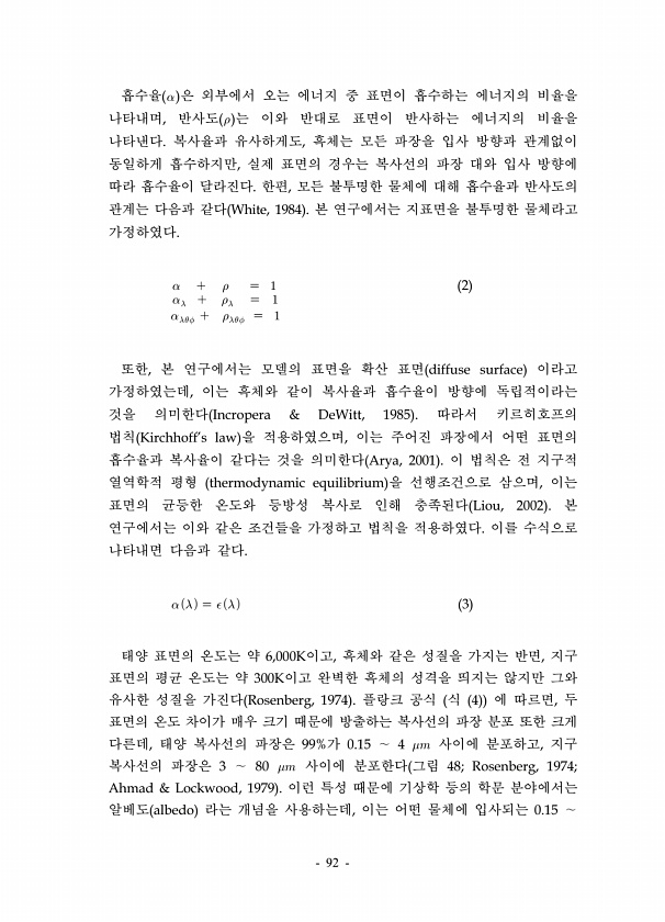92 흡수율 은 외부에서 오는 에너지 중 표면이 흡수하는 에너지의 비율을 나타내며, 반사도 는 이와 반대로 표면이 반사하는 에너지의 비율을 나타낸다. 복사율과 유사하게도, 흑체는 모든 파장을 입사 방향과 관계없이 동일하게 흡수하지만, 실제 표면의 경우는 복사선의 파장 대와 입사 방향에 따라 흡수율이 달라진다. 한편, 모든 불투명한 물체에 대해 흡수율과 반사도의 관계는 다음과 같다 White, 1984 본 연구에서는 지표면을 불투명한 물체라고 가정하였다. 2 또한, 본 연구에서는 모델의 표면을 확산 표면 diffuse surface 이라고 가정하였는데, 이는 흑체와 같이 복사율과 흡수율이 방향에 독립적이라는 것을 의미한다 Incrope...