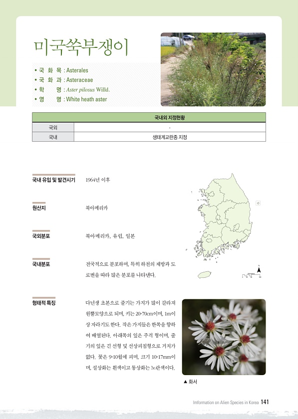 포유류 양서류 · 파충류 담수어류 곤충류 연체동물 외래식물 Imformation on Alien Species in Korea 141 국내 유입 및 발견시기 1964년 이후 원산지 북아메리카 국외분포 북아메리카, 유럽, 일본 국내분포 전국적으로 분포하며, 특히 하천의 제방과 도 로변을 따라 많은 분포를 나타낸다. 형태적 특징 다년생 초본으로 줄기는 가지가 많이 갈라져 원뿔모양으로 되며, 키는 20-70cm이며, 1m이 상 자라기도 한다. 작은 가지들은 한쪽을 향하 여 배열된다. 아래쪽의 잎은 주걱 형이며, 줄 기의 잎은 긴 선형 및 선상피침형으로 거치가 없다. 꽃은 9-10월에 피며, 크기 10-17mm이 며, 설상화는 흰색이고 통상화는 노란색이다. ? 국 화 목 Asterales ? 국 화 과 Astera...
