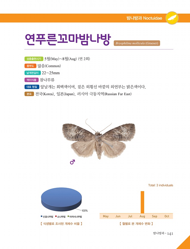 밤나방과?141 밤나방과 Noctuidae 성충출현시기 5월 May 8월 Aug 연 2회 풍부도 많음 Common 날개편길이 2225mm 먹이식물 참나무류 대표 형질 앞날개는 회백색이며, 짙은 외횡선 바깥의 외연부는 밝은색이다. 분포 전국 Korea , 일본 Japan , 러시아 극동지역 Russian Far East 연푸른꼬마밤나방 Bryophilina mollicula Graeser 【 월별로 본 개체수 변화 】 Total3 individuals May Jun Jul Aug Sep Oct 【 식생별로 조사된 개체수 비율 】 100% 신갈나무림 소나무림아까시나무림
