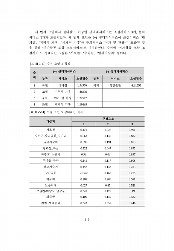 119 세 번째 요인에서 절대값 1 이상인 생태계서비스는 조절서비스 3개, 문화 서비스 1개가 도출되었다. 세 번째 요인은 + 생태계서비스에 조절서비스 ‘대 기질’, ‘지역적 기후’, ‘세계적 기후’와 문화서비스 ‘여가 및 관광’이 도출된 것 을 통해 ‘여가활동 포함 조절서비스’로 명명하였다. 수원에 ‘여가활동 포함 조 절서비스’ 생태자산 그룹은 ‘서호천’, ‘수원천’, ‘일왕저수지’ 등이다. 순 위 + 생태계서비스 생태계서비스 분류 서비스 요인점수 분류 서비스 요인점수 1 조절 대기질 1.54576 지지 영양순환 -4.61353 2 조절 지역적 기후 1.46808 3 문화 여가 및 관광 1.27517 4 조절 세계적 기후 1.19468 [표 Ⅲ-3-13] 수원 요인 3 특징 대상지 구성요소 1 2 3 서호...