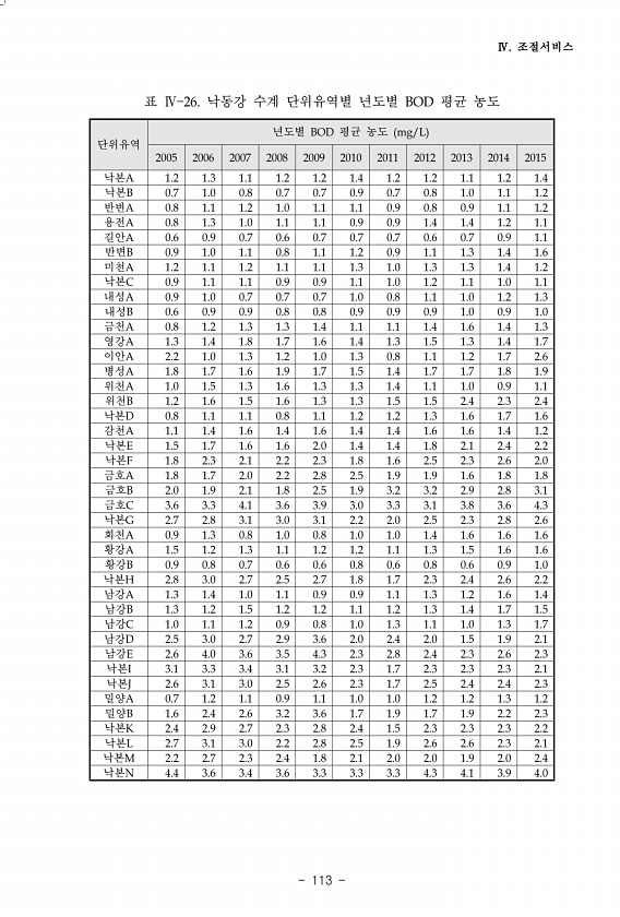 Ⅳ. 조절서비스 113 단위유역 년도별 BOD 평균 농도 mg/L 2005 2006 2007 2008 2009 2010 2011 2012 2013 2014 2015 낙본A 1.2 1.3 1.1 1.2 1.2 1.4 1.2 1.2 1.1 1.2 1.4 낙본B 0.7 1.0 0.8 0.7 0.7 0.9 0.7 0.8 1.0 1.1 1.2 반변A 0.8 1.1 1.2 1.0 1.1 1.1 0.9 0.8 0.9 1.1 1.2 용전A 0.8 1.3 1.0 1.1 1.1 0.9 0.9 1.4 1.4 1.2 1.1 길안A 0.6 0.9 0.7 0.6 0.7 0.7 0.7 0.6 0.7 0.9 1.1 반변B 0.9 1.0 1.1 0.8 1.1 1.2 0.9 1.1 1.3 1.4 1.6 미천A 1.2 1.1 1.2 1.1 ...