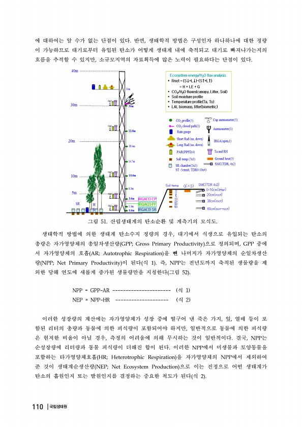 에 대하여는 알 수가 없는 단점이 있다 반면 생태학적 방법은 구성인자 하나하나에 대한 정량 이 가능하므로 대기로부터 유입된 탄소가 어떻게 생태계 내에 축적되고 대기로 빠져나가는지의 흐름을 추적할 수 있지만 소규모지역의 자료획득에 많은 노력이 필요하다는 단점이 있다 그림 51. 산림생태계의 탄소순환 및 계측기의 모식도. 생태학적 방법에 의한 생태계 탄소수지 정량의 경우 대기에서 식생으로 유입되는 탄소의 총량은 자가영양체의 총일차생산량 으로 정의되며 중에 서 자가영양체의 호흡 을 뺀 나머지가 자가영양체의 순일차생산 량 이 된다 식 즉 는 전년도까지 축적된 생물량을 제 외한 당해 연도에 새롭게 증가된 생물량만을 지칭한다 그림 NPP = GPP-AR ---------------------- 식 1 NEP = NPP...