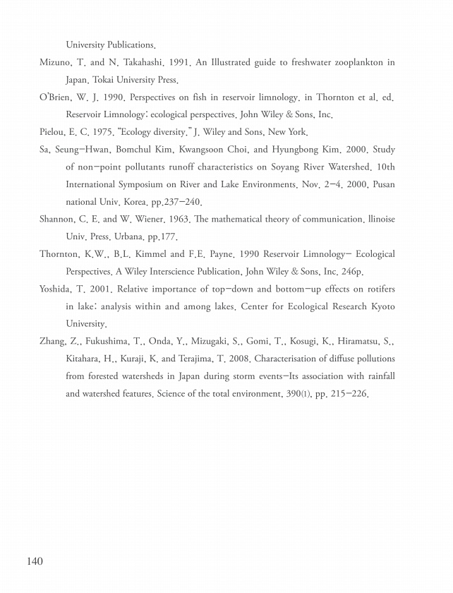 140 University Publications. Mizuno, T. and N. Takahashi. 1991. An Illustrated guide to freshwater zooplankton in Japan. Tokai University Press. O’Brien, W. J. 1990. Perspectives on fish in reservoir limnology. in Thornton et al. ed. Reservoir Limnologyecological perspectives. John Wiley & Sons, Inc. Pielou, E. C. 1975. “Ecology diversity.” J. Wiley and Sons, New York. Sa, Seung-Hwan, Bomchul Kim,...