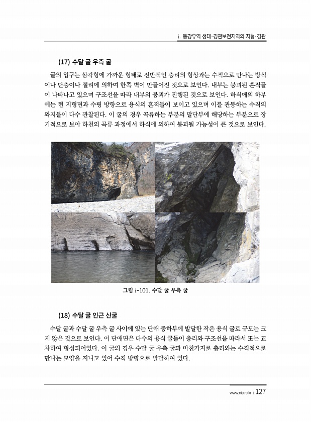 i. 동강유역 생태·경관보전지역의 지형·경관 www.nie.re.kr ?127 17 굴의 입구는 삼각형에 가까운 형태로 전반적인 층리의 형상과는 수직으로 만나는 방식 이나 단층이나 절리에 의하여 한쪽 벽이 만들어진 것으로 보인다. 내부는 붕괴된 흔적들 이 나타나고 있으며 구조선을 따라 내부의 붕괴가 진행된 것으로 보인다. 하식애의 하부 에는 현 지형면과 수평 방향으로 용식의 흔적들이 보이고 있으며 이를 관통하는 수직의 와지들이 다수 관찰된다. 이 굴의 경우 곡류하는 부분의 말단부에 해당하는 부분으로 장 기적으로 보아 하천의 곡류 과정에서 하식에 의하여 붕괴될 가능성이 큰 것으로 보인다. 그림 i-101. 수달 굴 우측 굴 18 수달 굴과 수달 굴 우측 굴 사이에 있는 단애 중하부에 발달한 작은 용식 굴로 규...