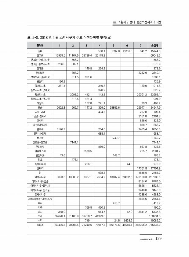 iii. 소황사구 생태·경관보전지역의 식생 www.nie.re.kr ?129 군락명 1 2 3 4 5 6 7 총합계 갈대 580.1 1092.0 13731.0 341.2 15744.3 갯그령 10968.5 11107.5 23789.4 20178.2 66043.6 갯그령-순비기나무 566.2 566.2 갯그령-통보리사초 266.8 309.1 575.9 갯메꽃 149.8 224.2 373.9 갯쇠보리 1607.2 2232.9 3840.1 갯쇠보리-달맞이꽃 311.5 991.6 1303.1 왕잔디 126.9 126.9 좀보리사초 381.1 349.8 180.9 911.8 좀보리사초-갯메꽃 328.2 328.2 통보리사초 3098.2 412.1 143.5 20301.2 23955.1 통보리사초-갯그령 813.5 1...