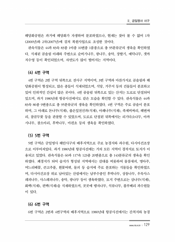 Ⅱ. 금일명사 사구 www.nie.re.kr ? 129 해당화공원은 과거에 해당화가 자생하여 분포하였으나, 현재는 찾아 볼 수 없어 1차 2000년 와 2차 2007년 에 걸쳐 복원사업으로 조성한 것이다. 관속식물은 44과 83속 83종 1아종 10변종 1품종으로 총 95분류군의 생육을 확인하였 다. 식재된 곰솔림 아래와 주변으로 순비기나무, 광나무, 송악, 장딸기, 예덕나무, 갯까 치수영 등이 확인되었으며, 자연도가 많이 떨어지는 지역이다. 4 4번 구역 4번 구역은 2번 구역 뒤쪽으로 전사구 지역이며, 3번 구역과 마찬가지로 곰솔림과 해 당화공원이 형성되고, 많은 종들이 식재되었으며, 식당, 거주지 등의 건물들이 분포하고 있어 인위적인 간섭이 많은 곳이다. 4번 곰솔림 뒤쪽으로 있는 산지는 도로로 단절되...
