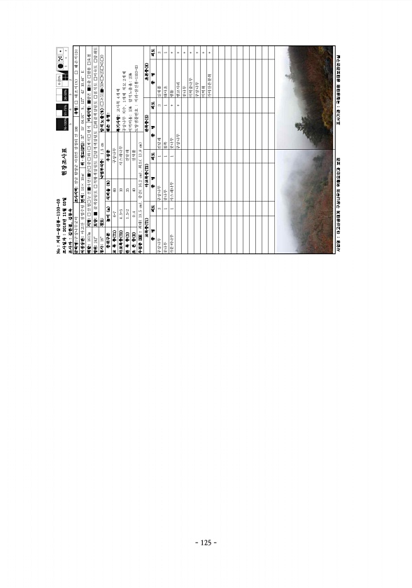 No 지리-삼신봉-1103-03 조사일자 2018년 11월 03일 조사자 김한결, 김?? 현장조사표 군락명구상나무군락 조사지역경남 함양군 마천면 강청리 산 100 유형□ 대조지 N □ 훼손지 D 식생상관아고산 침엽수림 면적10× 10㎡ 위·경도 GPS 35° 19′ 04.91″ N, 127° 42′ 10.44″ E 해발1617m 지형□산정□능선■사면 ■상□중□하 □계곡□평지 미세지형■평면 ■돌출 □함몰 □요철 방위242° 토양■ 갈색삼림토 □적황색삼림토 □암적색삼림토 □회갈색삼림토 □침식토 □미숙토 □암쇄토 경사16° 경도낙엽부식층1.5 cm 암석노출 % □≥51■ 50 □ 25□ 5□0 층위구분 높이 m 식피율 % 우점종 훼손 유형교 목 층 T1 6-7 60 구상나무 특기사항고사목 4개체 구상나무 치수, ...