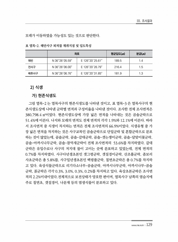 III. 조사결과 www.nie.re.kr ?129 모래가 이동하였을 가능성도 있는 것으로 판단한다. 좌표 평균입도 ㎛ 분급 ㎛ 해빈 N 36°28′05.59″ E 126°20′25.61″ 189.5 1.4 전사구 N 36°28′06.00″ E 126°20′26.79″ 216.4 1.5 배후사구 N 36°28′06.76″ E 126°20′31.85″ 181.9 1.3 표 열목-2. 해안사구 퇴적물 채취지점 및 입도특성 2 그림 열목-2 는 열목사구의 현존식생도를 나타낸 것이고, 표 열목-3 은 열목사구의 현 존식생도상에 나타낸 군락별 면적과 구성비율을 나타낸 것이다. 조사한 전체 조사면적은 380,798.4 ㎡이었다. 현존식생도상에 가장 넓은 면적을 나타내는 것은 곰솔군락으로 51.4%에 이른다. 나지와 모...