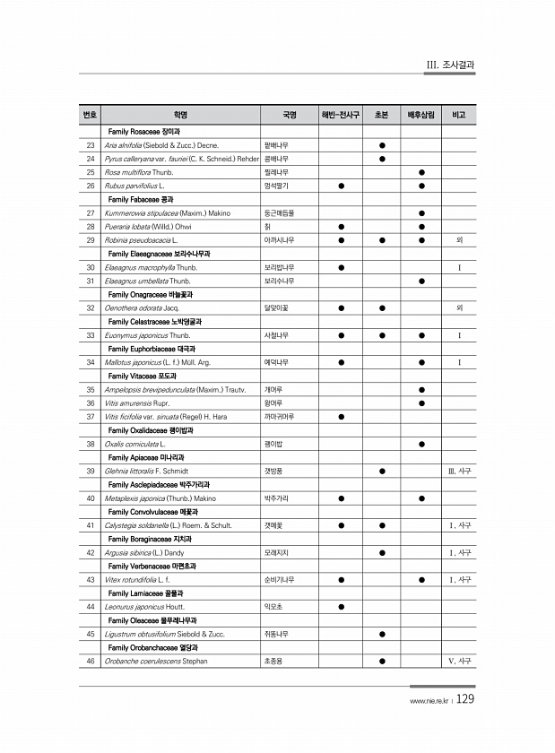 III. 조사결과 www.nie.re.kr ?129 번호 학명 국명 해빈-전사구 초본 배후삼림 비고 Family Rosaceae 장미과 23 Aria alnifolia Siebold & Zucc. Decne. 팥배나무 ● 24 Pyrus calleryana var. fauriei C. K. Schneid. Rehder 콩배나무 ● 25 Rosa multiflora Thunb. 찔레나무 ● 26 Rubus parvifolius L. 멍석딸기 ● ● Family Fabaceae 콩과 27 Kummerowia stipulacea Maxim. Makino 둥근매듭풀 ● 28 Pueraria lobata Willd. Ohwi 칡 ● ● 29 Robinia pseudoacacia L. 아까시나무 ● ● ● 외 Fami...