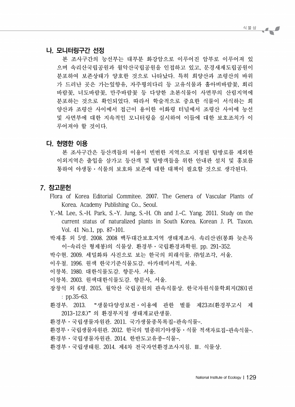 식 물 상 National Institute of EcologyⅠ129 나. 모니터링구간 선정 본 조사구간의 능선부는 대부분 화강암으로 이루어진 암부로 이루어져 있 으며 속리산국립공원과 월악산국립공원을 인접하고 있고, 문경새재도립공원이 분포하여 보존상태가 양호한 것으로 나타났다. 특히 희양산과 조령산의 바위 가 드러난 곳은 가는잎향유, 자주꿩의다리 등 고유식물과 홀아비바람꽃, 회리 바람꽃, 너도바람꽃, 만주바람꽃 등 다양한 초본식물이 사면부의 산림지역에 분포하는 것으로 확인되었다. 따라서 학술적으로 중요한 식물이 서식하는 희 양산과 조령산 사이에서 접근이 용이한 이화령 터널에서 조령산 사이에 능선 및 사면부에 대한 지속적인 모니터링을 실시하여 이들에 대한 보호조치가 이 루어져야 할 것이다. 다. 현명한 이용...
