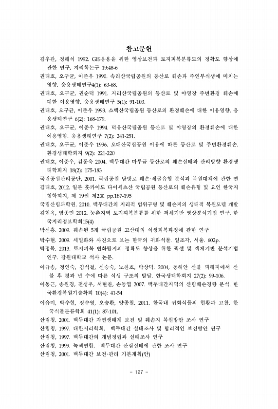 127 참고문헌 김우관, 정해식 1992. GIS응용을 위한 영상보전과 토지피복분류도의 정확도 향상에 관한 연구, 지리학논구 1948-6 권태호, 오구균, 이준우 1990. 속리산국립공원의 등산로 훼손과 주연부식생에 미치는 영향. 응용생태연구4 1 63-68. 권태호, 오구균, 권순덕 1991. 지리산국립공원의 등산로 및 야영장 주변환경 훼손에 대한 이용영향. 응용생태연구 5 1 91-103. 권태호, 오구균, 이준우 1993. 소백산국립공원 등산로의 환경훼손에 대한 이용영향. 응 용생태연구 6 2 168-179. 권태호, 오구균, 이준우 1994. 덕유산국립공원 등산로 및 야영장의 환경훼손에 대한 이용영향. 응용생태연구 7 2 241-251. 권태호, 오구균, 이준우 1996. 오대산국립공원 이용에 따른 ...
