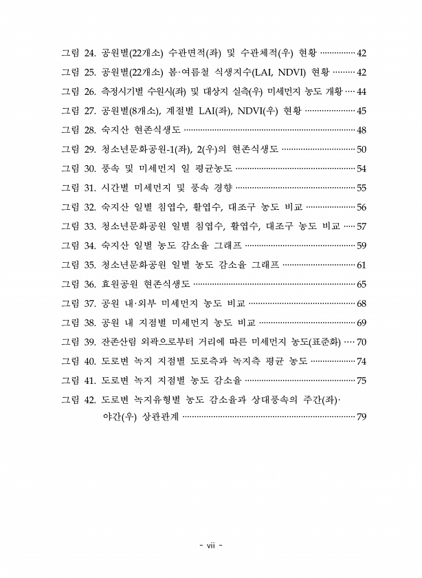 vii 그림 24. 공원별 22개소 수관면적 좌 및 수관체적 우 현황 ···············42 그림 25. 공원별 22개소 봄·여름철 식생지수 LAI, NDVI 현황 ·········42 그림 26. 측정시기별 수원시 좌 및 대상지 실측 우 미세먼지 농도 개황 ···· 44 그림 27. 공원별 P개소 , 계절별 LAI 좌 , NDVI 우 현황 ·····················45 그림 2P. 숙지산 현존식생도 ·········································································4P 그림 28. 청소년문화공원-1 좌 , 2 우 의 현존식생도 ·······························50 그림 30. 풍속 및 미세먼지 일 ...