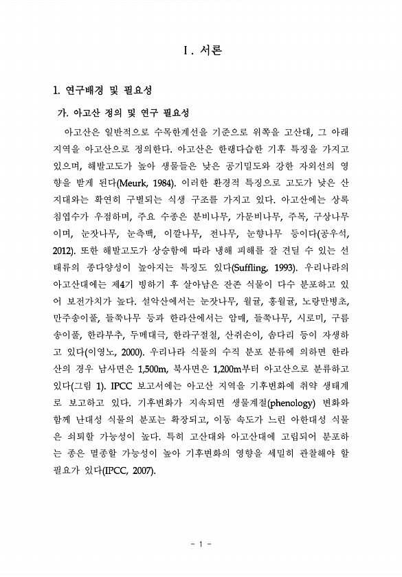 1 Ⅰ. 서론 1. 연구배경 및 필요성 가. 아고산 정의 및 연구 필요성 아고산은 일반적으로 수목한계선을 기준으로 위쪽을 고산대 그 아래 지역을 아고산으로 정의한다 아고산은 한랭다습한 기후 특징을 가지고 있으며 해발고도가 높아 생물들은 낮은 공기밀도와 강한 자외선의 영 향을 받게 된다 이러한 환경적 특징으로 고도가 낮은 산 지대와는 확연히 구별되는 식생 구조를 가지고 있다 아고산에는 상록 침엽수가 우점하며 주요 수종은 분비나무 가문비나무 주목 구상나무 이며 눈잣나무 눈측백 이깔나무 전나무 눈향나무 등이다 공우석 또한 해발고도가 상승함에 따라 냉해 피해를 잘 견딜 수 있는 선 태류의 종다양성이 높아지는 특징도 있다 우리나라의 아고산대에는 제 기 빙하기 후 살아남은 잔존 식물이 다수 분포하고 있 어 보전가치가 ...