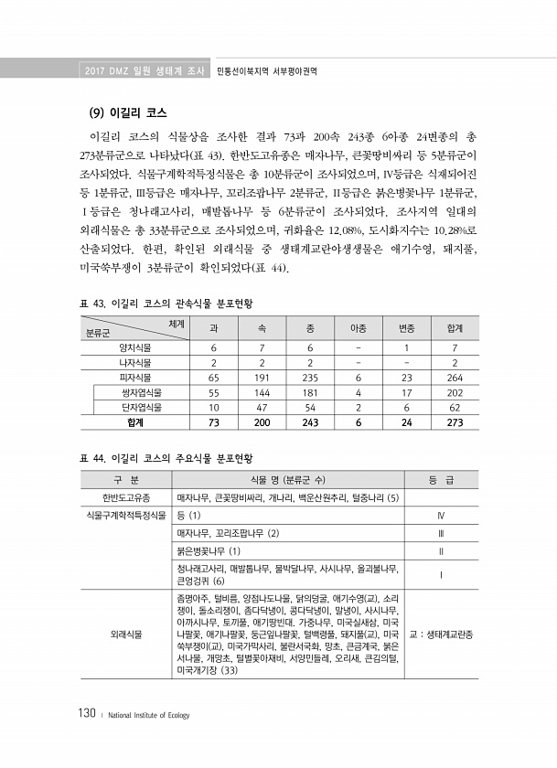2017 DMZ 일원 생태계 조사 민통선이북지역 서부평야권역 130 ? National Institute of Ecology 9 이길리 코스 이길리 코스의 식물상을 조사한 결과 73과 200속 243종 6아종 24변종의 총 273분류군으로 나타났다 표 43 한반도고유종은 매자나무, 큰꽃땅비싸리 등 5분류군이 조사되었다. 식물구계학적특정식물은 총 10분류군이 조사되었으며, Ⅳ등급은 식재되어진 등 1분류군, Ⅲ등급은 매자나무, 꼬리조팝나무 2분류군, Ⅱ등급은 붉은병꽃나무 1분류군, Ⅰ등급은 청나래고사리, 매발톱나무 등 6분류군이 조사되었다. 조사지역 일대의 외래식물은 총 33분류군으로 조사되었으며, 귀화율은 12.08%, 도시화지수는 10.28%로 산출되었다. 한편, 확인된 외래식물 중 생태계교란야생생물은 애기...