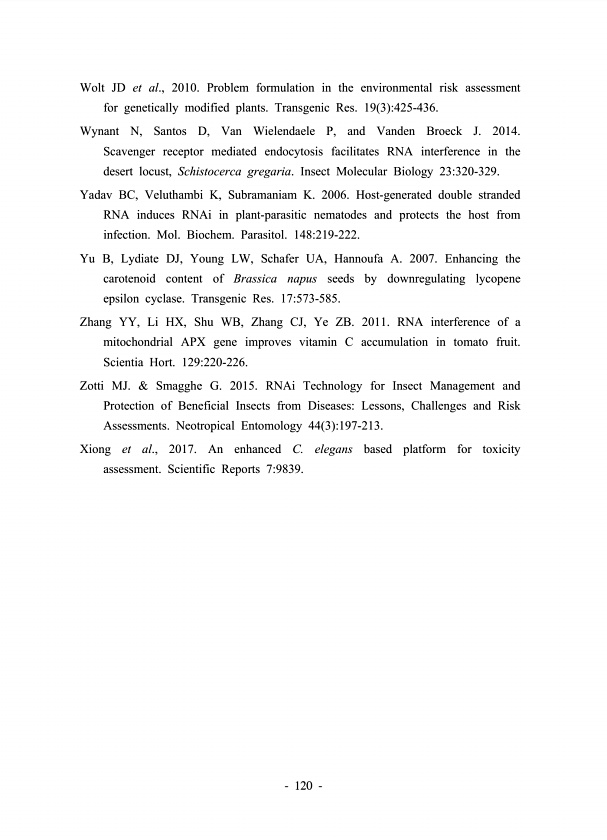 120 Wolt JD et al., 2010. Problem formulation in the environmental risk assessment for genetically modified plants. Transgenic Res. 19 3 425-436. Wynant N, Santos D, Van Wielendaele P, and Vanden Broeck J. 2014. Scavenger receptor mediated endocytosis facilitates RNA interference in the desert locust, Schistocerca gregaria. Insect Molecular Biology 23320-329. Yadav BC, Veluthambi K, Subramaniam K....