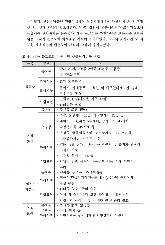 등이었다. 천연기념물인 원앙이 3마당 저수지에서 1회 관찰되어 좀 더 면밀 한 서식실태 파악이 필요하였다. 3마당 상단에 물총새습지가 조성되었으나 물총새를 관찰하지는 못하였다. 대구 불로고분 자연마당은 고분군을 포함해 넓은 녹지가 분포하여 야생조류 서식에 유리하였다. 그러나 조사기간 중 과 도한 제초작업이 빈번하여 서식지 교란이 우려되었다. 항목 구분 내용 식물상 출현종 ?77과 204속 208종 2아종 45변종 18품종, 총 273분류군 귀화식물 ?21과 50분류군 특이사항 ?물여뀌, 털새동부 → 북한 및 대구일대에서만 생육, 보호조치 필요 위협요인 ?인위적 간섭 과도한 제초 작업 ?외래식물 번성 육상 곤충 출현종 ?총 8목 62과 159종 우점종 ?종수노린재목 46종, 딱정벌레목 41종 등 ?개체수노린재...
