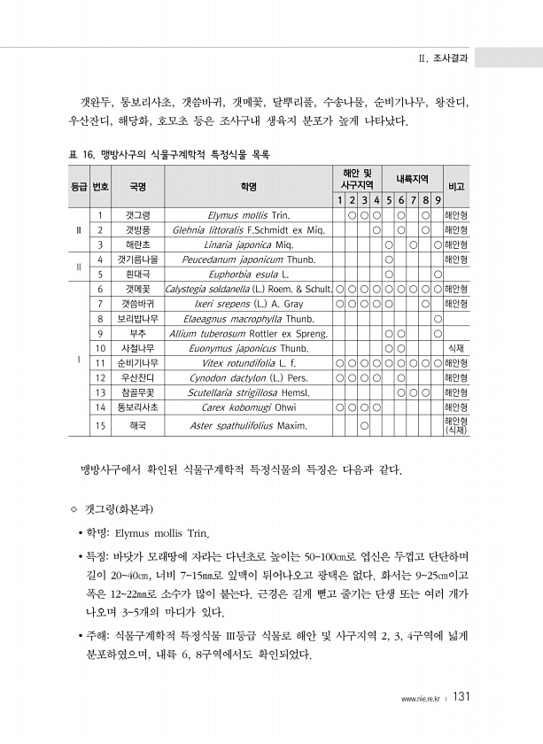 Ⅱ. 조사결과 www.nie.re.kr ? 131 갯완두, 통보리사초, 갯씀바귀, 갯메꽃, 달뿌리풀, 수송나물, 순비기나무, 왕잔디, 우산잔디, 해당화, 호모초 등은 조사구내 생육지 분포가 높게 나타났다. 표 16. 맹방사구의 식물구계학적 특정식물 목록 등급 번호 국명 학명 해안 및 사구지역 내륙지역 비고 1 2 3 4 5 6 7 8 9 Ⅲ 1 갯그령 Elymus mollis Trin. ○ ○ ○ ○ ○ 해안형 2 갯방풍 Glehnia littoralis F.Schmidt ex Miq. ○ ○ ○ 해안형 3 해란초 Linaria japonica Miq. ○ ○ ○ 해안형 Ⅱ 4 갯기름나물 Peucedanum japonicum Thunb. ○ 해안형 5 흰대극 Euphorbia esula L. ○ ○ Ⅰ 6 ...
