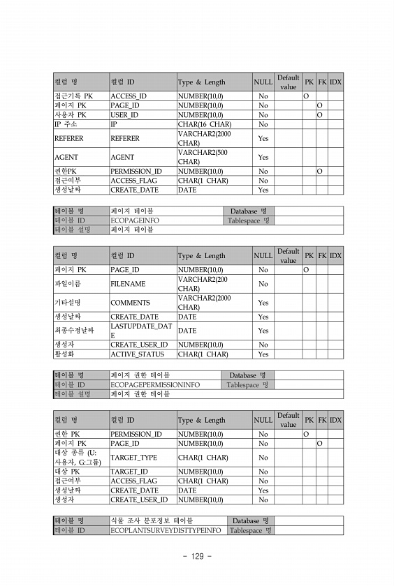 129 컬럼 명 컬럼 ID Type & Length NULL Default value PK FK IDX 접근기록 PK ACCESS_ID NUMBER 10,0 No O 페이지 PK PAGE_ID NUMBER 10,0 No O 사용자 PK USER_ID NUMBER 10,0 No O IP 주소 IP CHAR 16 CHAR No REFERER REFERER VARCHAR2 2000 CHAR Yes AGENT AGENT VARCHAR2 500 CHAR Yes 권한PK PERMISSION_ID NUMBER 10,0 No O 접근여부 ACCESS_FLAG CHAR 1 CHAR No 생성날짜 CREATE_DATE DATE Yes 테이블 명 페이지 테이블 Database 명 테이블 ID ECOPAGEINFO Tablesp...