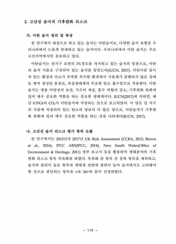 119 2. 고산성 습지의 기후변화 리스크 가. 이탄 습지 정의 및 특징 본 연구에서 대상으로 하고 있는 습지는 이탄습지로, 다양한 습지 유형중 우 리나라에서 드물게 존재하고 있는 습지이다. 우리나라에서 이탄 습지는 주로 고산지역에서만 분포하고 있다. 이탄습지는 전지구 표면의 3%정도를 차지하고 있는 습지의 일종으로, 이탄 과 습지 식물로 구성되어 있는 습지를 일컫는다 IUCN, 2017 이탄이란 물이 차 있는 환경과 산소가 부족한 특수한 환경에서 식물체가 분해되지 않은 상태 로 쌓여 생성된 물질로, 육상생태계의 주요한 탄소 흡수원으로 작용한다. 이탄 습지는 생물 다양성의 보전, 식수의 제공, 홍수 위협의 감소, 기후변화 완화에 있어 매우 중요한 역할을 하는 중요한 생태계이다. IUCN 2017 에 의하면,...