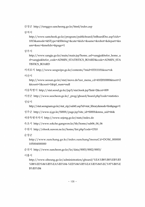 126 산청군 http//tonggye.sancheong.go.kr/html/index.asp 삼척시 http//www.samcheok.go.kr/program/publicboard/lstBoardDoc.asp?cidx= 1013&amode=&SType=&SString=&cate=&idx=&same=&robot=&depart=&n um=&sec=&mefidx=&page=1 상주시 http//www.sangju.go.kr/main/main.jsp?home_url=sangju&befor_home_u rl=sangju&befor_code=ADMIN_STATISTICS_BOARD&code=ADMIN_STA TISTICS_BOARD 서귀포시 http//www.seogwipo.go.kr/contents/?mid=033...