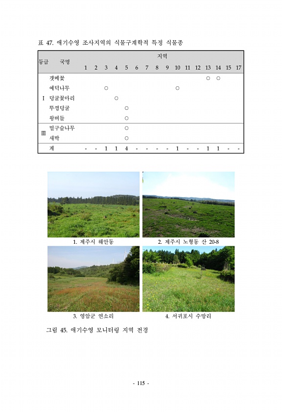 115 등급 국명 지역 1 2 3 4 5 6 7 8 9 10 11 12 13 14 15 17 Ⅰ 갯메꽃 ○ ○ 예덕나무 ○ ○ 덩굴꽃마리 ○ 뚜껑덩굴 ○ 왕버들 ○ Ⅲ 멀구슬나무 ○ 새박 ○ 계 1 1 4 1 1 1 표 47. 애기수영 조사지역의 식물구계학적 특정 식물종 1. 제주시 해안동 2. 제주시 노형동 산 20-8 3. 영암군 연소리 4. 서귀포시 수망리 그림 45. 애기수영 모니터링 지역전경