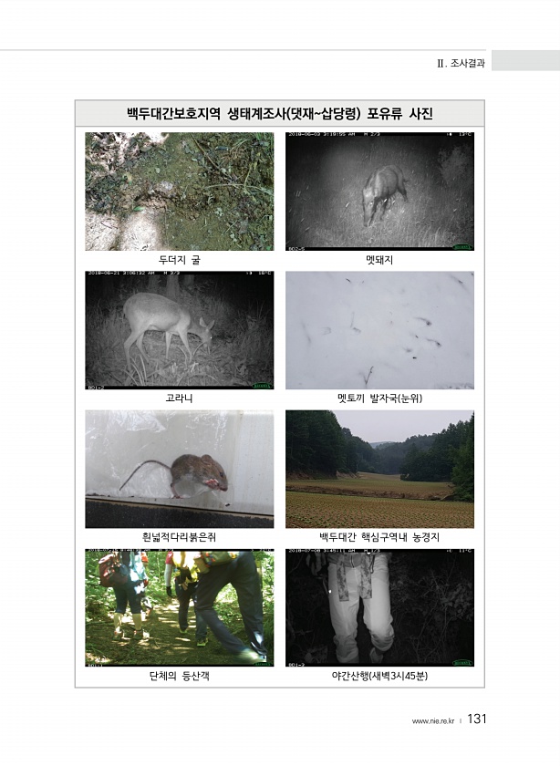 Ⅱ. 조사결과 www.nie.re.kr ? 131 백두대간보호지역 생태계조사 댓재삽당령 포유류 사진 두더지 굴 멧돼지 고라니 멧토끼 발자국 눈위 흰넓적다리붉은쥐 백두대간 핵심구역내 농경지 단체의 등산객 야간산행 새벽3시45분
