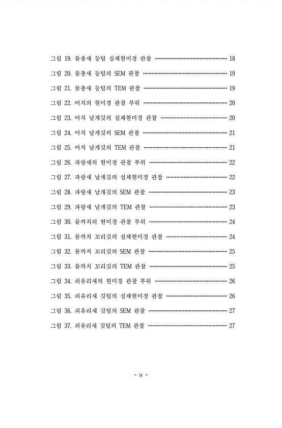 ix 그림 19. 물총새 등털 실체현미경 관찰 ··················································18 그림 20. 물총새 등털의 SEM 관찰 ···························································19 그림 21. 물총새 등털의 TEM 관찰 ··························································19 그림 22. 어치의 현미경 관찰 부위 ··························································20 그림 23. 어치 날개깃의 실체현미경 관찰 ··············································20...