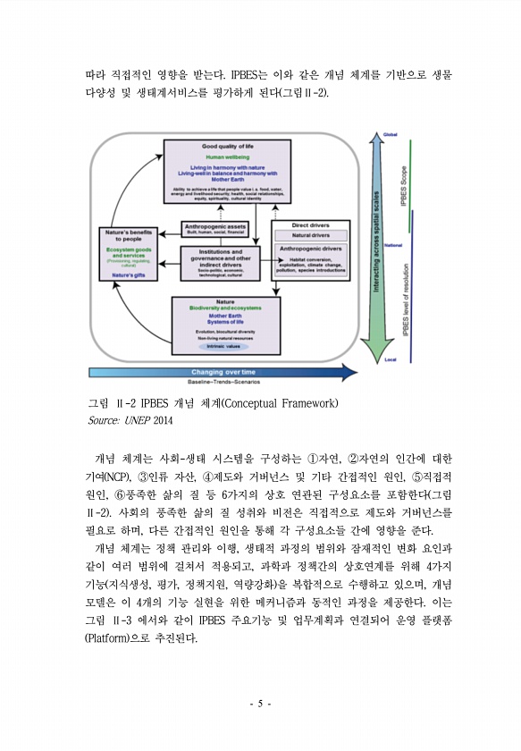 따라 직접적인 영향을 받는다. IPBES는 이와 같은 개념 체계를 기반으로 생물 다양성 및 생태계서비스를 평가하게 된다 그림Ⅱ-2 그림 Ⅱ-2 IPBES 개념 체계 Conceptual Framework SourceUNEP 2014 개념 체계는 사회-생태 시스템을 구성하는 ①자연, ②자연의 인간에 대한 기여 NCP , ③인류 자산, ④제도와 거버넌스 및 기타 간접적인 원인, ⑤직접적 원인, ⑥풍족한 삶의 질 등 6가지의 상호 연관된 구성요소를 포함한다 그림 Ⅱ-2 사회의 풍족한 삶의 질 성취와 비전은 직접적으로 제도와 거버넌스를 필요로 하며, 다른 간접적인 원인을 통해 각 구성요소들 간에 영향을 준다. 개념 체계는 정책 관리와 이행, 생태적 과정의 범위와 잠재적인 변화 요인과 같이 여러 범위에 걸쳐서 적용되고...