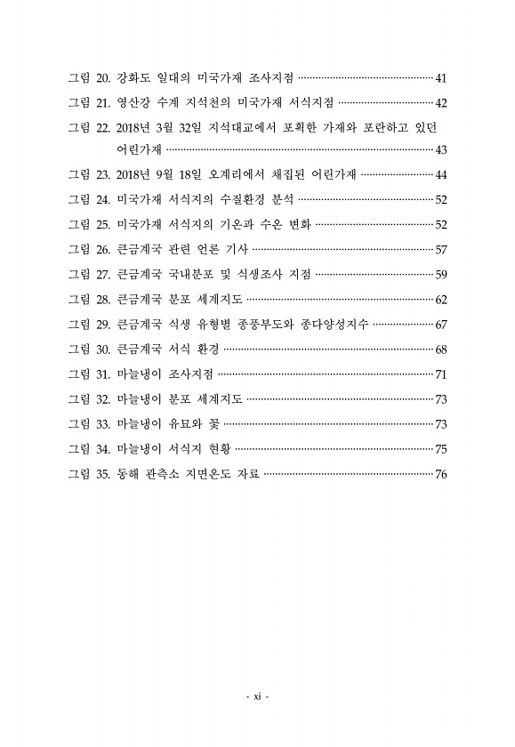 xi 그림 20. 강화도 일대의 미국가재 조사지점 ···············································41 그림 21. 영산강 수계 지석천의 미국가재 서식지점 ·································42 그림 22. 2018년 3월 32일 지석대교에서 포획한 가재와 포란하고 있던 어린가재 ·····························································································43 그림 23. 2018년 9월 18일 오계리에서 채집된 어린가재 ·························44 그림 24. 미국가재 서식지의 수질환경 분석 ·························...