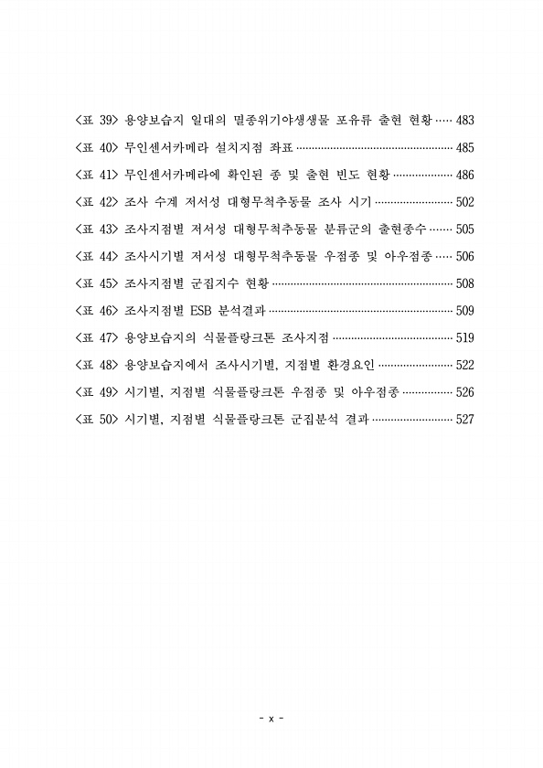 2939 표 용양보습지 일대의 멸종위기야생생물 포유류 출현 현황 ····· 483 40 표 무인센서카메라 설치지점 좌표 ··················································· 485 41 표 무인센서카메라에 확인된 종 및 출현 빈도 현황 ··················· 486 42 표 조사 수계 저서성 대형무척추동물 조사 시기 ························· 502 43 표 조사지점별 저서성 대형무척추동물 분류군의 출현종수 ······· 505 44 표 조사시기별 저서성 대형무척추동물 우점종 및 아우점종 ····· 506 45 표 조사지점별 군집지수 현황 ·······················································...