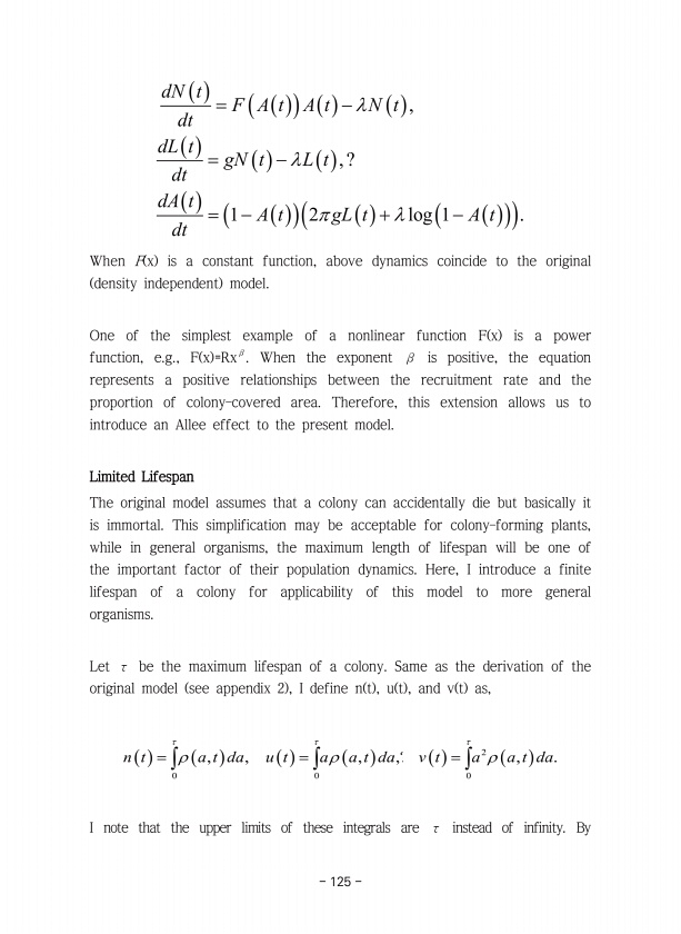 125 , , ? 1 2 log 1 dN t F A t A t N t dt dL t gN t L t dt dA t A t gL t A t dt l l p l = = = + When F x is a constant function, above dynamics coincide to the original density independent model. One of the simplest example of a nonlinear function F x is a power function, e.g., F x =Rxβ. When the exponent β is positive, the equation represents a positive relationships between the recruitment rate ...