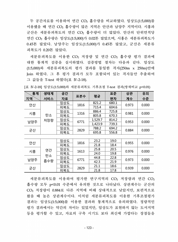두 공간자료를 이용하여 연간 CO2 흡수량을 비교하였다. 임상도 15,000 를 이용했을 때 연간 CO2 흡수량이 많은 지역은 안산과 남양주 지역이다. 시흥과 군산은 세분류피복도의 연간 CO2 흡수량이 더 많았다. 안산의 단위면적당 연간 CO2 흡수량은 임상도 15,000 가 0.02톤 많았으며, 시흥은 세분류피복도가 0.45톤 많았다. 남양주는 임상도 15,000 가 0.45톤 많았고, 군산은 세분류 피복도가 0.20톤 많았다. 세분류피복도를 이용한 CO2 저장량 및 연간 CO2 흡수량 평가 결과에 대한 통계적 검증을 실시하였다. 검증방법 절차는 다음과 같다. 임상도 15,000 와 세분류피복도의 평가 결과를 동일한 격자 250m x 250m 안에 Join 하였다. 그 후 평가 결과가 모두 포함되어 있는 ...
