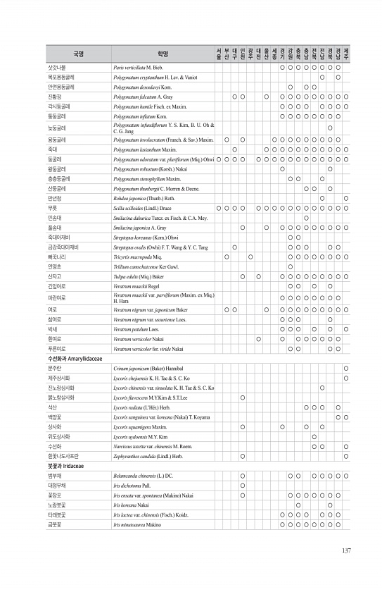 137 삿갓나물 Paris verticillata M. Bieb. ○ ○ ○ ○ ○ ○ ○ ○ 목포용둥굴레 Polygonatum cryptanthum H. Lev. & Vaniot ○ ○ 안면용둥굴레 Polygonatum desoulavyi Kom. ○ ○ ○ 진황정 Polygonatum falcatum A. Gray ○ ○ ○ ○ ○ ○ ○ ○ ○ ○ ○ ○ 각시둥굴레 Polygonatum humile Fisch. ex Maxim. ○ ○ ○ ○ ○ ○ ○ ○ 퉁둥굴레 Polygonatum infatum Kom. ○ ○ ○ ○ ○ ○ ○ ○ 늦둥굴레 Polygonatum infundiforum Y. S. Kim, B. U. Oh & C. G. Jang ○ 용둥굴레 Polygonatum involucratu...
