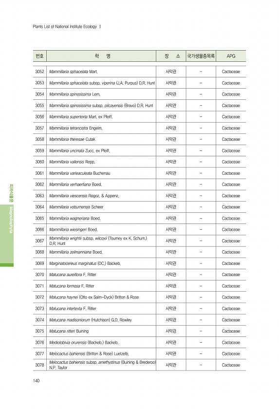 140 번호 학 명 장 소 국가생물종목록 APG 피자식물문 Magnoliophyta Plants List of National Institute Ecology Ⅰ 3052 Mammillaria sphacelata Mart. 사막관 Cactaceae 3053 Mammillaria sphacelata subsp. viperina J.A. Purpus D.R. Hunt 사막관 Cactaceae 3054 Mammillaria spinosissima Lem. 사막관 Cactaceae 3055 Mammillaria spinosissima subsp. pilcayensis Bravo D.R. Hunt 사막관 Cactaceae 3056 Mammillaria supertexta Mart. ex Pfeiff. 사막관 Cact...