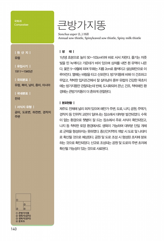 140 ① ② ③ ④ ① 큰방가지똥 ② 생육지 공터 ③ 생육지 공터 ④ 분포도 | 생 태 | 1년생 초본으로 높이 50100cm이며 바로 서서 자란다. 줄기는 자줏 빛을 띤 녹색이고 가운데가 비어 있으며 상처를 내면 흰 유액이 나온 다. 꽃은 59월에 피며 두화는 지름 2cm로 황색이고 설상화만으로 이 루어진다. 열매는 바람을 타고 산포한다. 방가지똥에 비해 더 건조하고 무덥고, 척박한 입지조건에서 잘 살아남아 중부 유럽의 건강한 목초지 에는 방가지똥만 관찰되는데 반해, 도시화되어 온난, 건조, 척박해진 환 경에는 큰방가지똥이 더 흔하게 관찰된다. | 분포현황 | 제주도 전체에 널리 퍼져 있으며 해안가 주변, 도로, 나지, 공원, 주택가, 경작지 등 인위적 교란이 일어나는 장소에서 대부분 발견되었다. 수목 ...
