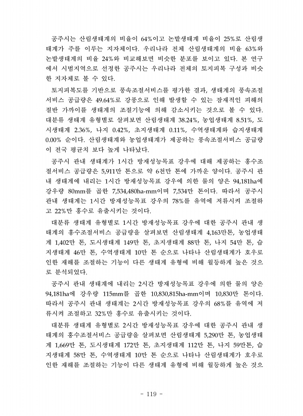 119 공주시는 산림생태계의 비율이 이고 논밭생태계 비율이 로 산림생 태계가 주를 이루는 지자체이다 우리나라 전체 산림생태계의 비율 와 논밭생태계의 비율 와 비교해보면 비슷한 분포를 보이고 있다 본 연구 에서 시범지역으로 선정한 공주시는 우리나라 전체의 토지피복 구성과 비슷 한 지자체로 볼 수 있다 토지피복도를 기반으로 풍속조절서비스를 평가한 결과 생태계의 풍속조절 서비스 공급량은 로 강풍으로 인해 발생할 수 있는 잠재적인 피해의 절반 가까이를 생태계의 조절기능에 의해 감소시키는 것으로 볼 수 있다 대분류 생태계 유형별로 살펴보면 산림생태계 농업생태계 도 시생태계 나지 초지생태계 수역생태계와 습지생태계 순이다 산림생태계와 농업생태계가 제공하는 풍속조절서비스 공급량 이 전국 평균치 보다 높게 나타났다 공주시 ...