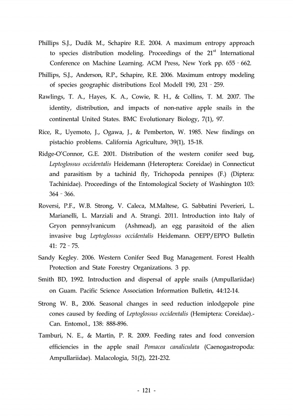 121 Phillips S.J., Dudik M., Schapire R.E. 2004. A maximum entropy approach to species distribution modeling. Proceedings of the 21st International Conference on Machine Learning. ACM Press, New York pp. 655?662. Phillips, S.J., Anderson, R.P., Schapire, R.E. 2006. Maximum entropy modeling of species geographic distributions Ecol Modell 190, 231?259. Rawlings, T. A., Hayes, K. A., Cowie, R. H., & ...