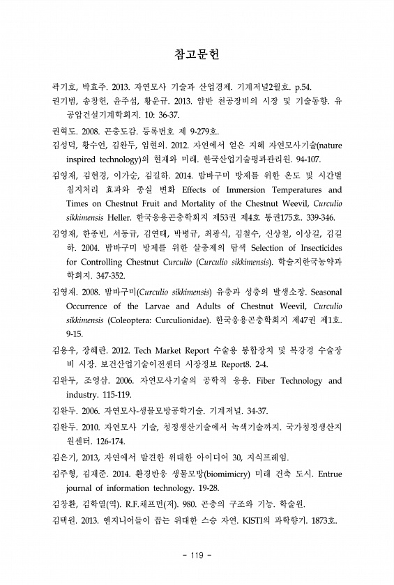 119 참고문헌 곽기호, 박효주. 2013. 자연모사 기술과 산업경제. 기계저널2월호. p.54. 권기범, 송창헌, 윤주섭, 황운규. 2013. 암반 천공장비의 시장 및 기술동향. 유 공압건설기계학회지. 1036-37. 권혁도. 2008. 곤충도감. 등록번호 제 9-279호. 김성덕, 황수언, 김완두, 임현의. 2012. 자연에서 얻은 지혜 자연모사기술 nature inspired technology 의 현재와 미래. 한국산업기술평과관리원. 94-107. 김영재, 김현경, 이가순, 김길하. 2014. 밤바구미 방제를 위한 온도 및 시간별 침지처리 효과와 종실 변화 Effects of Immersion Temperatures and Times on Chestnut Fruit and Mortality of th...