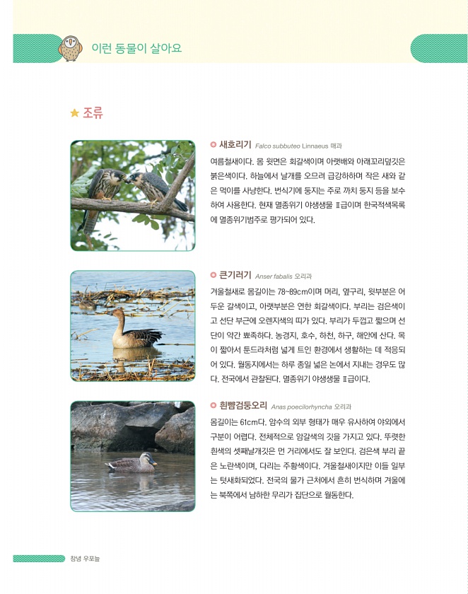창녕 우포늪 조류 새호리기 Falco subbuteo Linnaeus 매과 여름철새이다. 몸 윗면은 회갈색이며 아랫배와 아래꼬리덮깃은 붉은색이다. 하늘에서 날개를 오므려 급강하하며 작은 새와 같 은 먹이를 사냥한다. 번식기에 둥지는 주로 까치 둥지 등을 보수 하여 사용한다. 현재 멸종위기 야생생물Ⅱ급이며 한국적색목록 에 멸종위기범주로 평가되어 있다. 큰기러기 Anser fabalis 오리과 겨울철새로 몸길이는 7889cm이며 머리, 옆구리, 윗부분은 어 두운 갈색이고, 아랫부분은 연한 회갈색이다. 부리는 검은색이 고 선단 부근에 오렌지색의 띠가 있다. 부리가 두껍고 짧으며 선 단이 약간 뾰족하다. 농경지, 호수, 하천, 하구, 해안에 산다. 목 이 짧아서 툰드라처럼 넓게 트인 환경에서 생활하는 데 적응되 어...