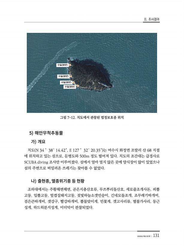 II. 조사결과 www.nie.re.kr ?131 그림 7-12. 치도에서 관찰된 법정보호종 위치 5 치도 N 34˚ 38′ 14.42″, E 127˚ 32′ 20.35″ 는 여수시 화정면 조발리 산 68 지점 에 위치하고 있는 섬으로, 둔병도와 500m 정도 떨어져 있다. 치도의 조간대는 급경사로 SCUBA diving 조사만 이루어졌다. 섬에서 얼마 멀지 않은 곳에 양식장이 많이 있었으나 섬의 주변으로 떠밀려온 쓰레기는 찾아볼 수 없었다. , 조하대에서는 주황해변해면, 곧은지총산호류, 무쓰뿌리돌산호, 세로줄조개사돈, 피뿔 고둥, 입뿔고둥, 털껍질돼지고둥, 젖빛하늘소갯민숭이, 긴네모돌조개, 조무래기따개비, 검은큰따개비, 갯강구, 빨강따개비, 뿔물맞이게, 민꽃게, 갯고사리류, 별불가사리, 둥근 성게, 하드윅...