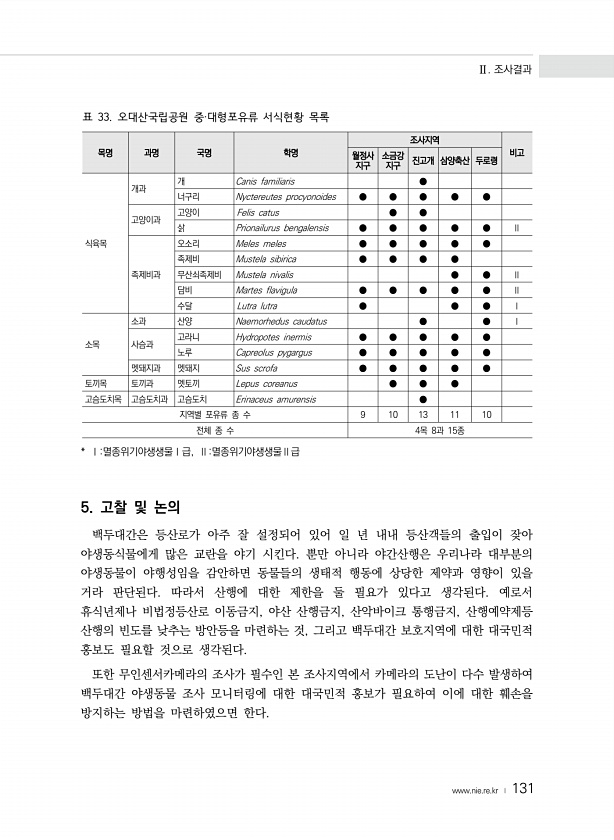 Ⅱ. 조사결과 www.nie.re.kr ? 131 목명 과명 국명 학명 조사지역 월정사 비고 지구 소금강 지구 진고개 삼양축산 두로령 식육목 개과 개 Canis familiaris ● 너구리 Nyctereutes procyonoides ● ● ● ● ● 고양이과 고양이 Felis catus ● ● 삵 Prionailurus bengalensis ● ● ● ● ● Ⅱ 족제비과 오소리 Meles meles ● ● ● ● ● 족제비 Mustela sibirica ● ● ● ● 무산쇠족제비 Mustela nivalis ● ● Ⅱ 담비 Martes flavigula ● ● ● ● ● Ⅱ 수달 Lutra lutra ● ● ● Ⅰ 소목 소과 산양 Naemorhedus caudatus ● ● Ⅰ 사슴과 고라니 Hydrop...
