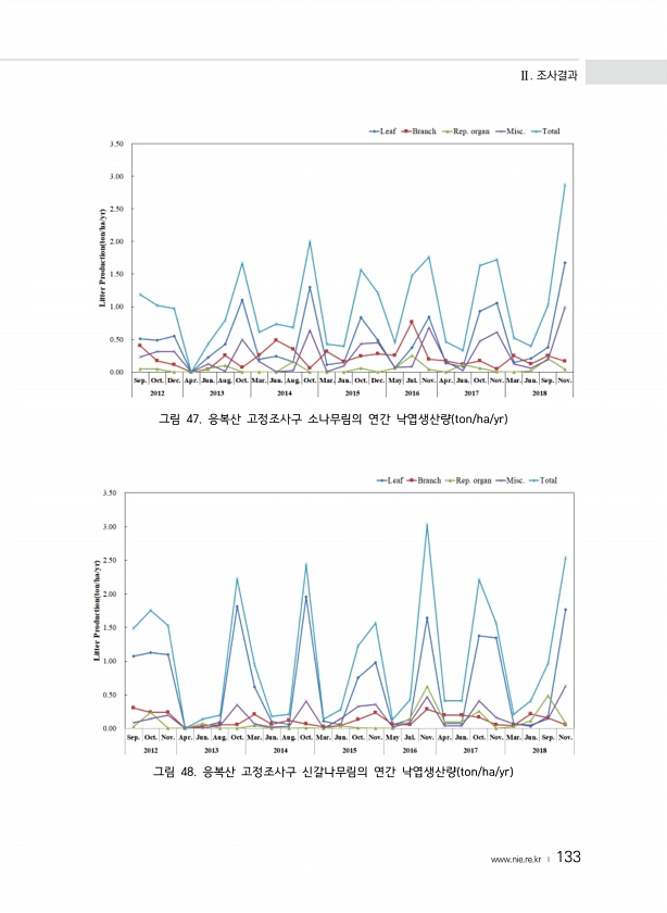 Ⅱ. 조사결과 www.nie.re.kr ? 133 그림 47. 응복산 고정조사구 소나무림의 연간 낙엽생산량 ton/ha/yr 그림 48. 응복산 고정조사구 신갈나무림의 연간 낙엽생산량 ton/ha/yr
