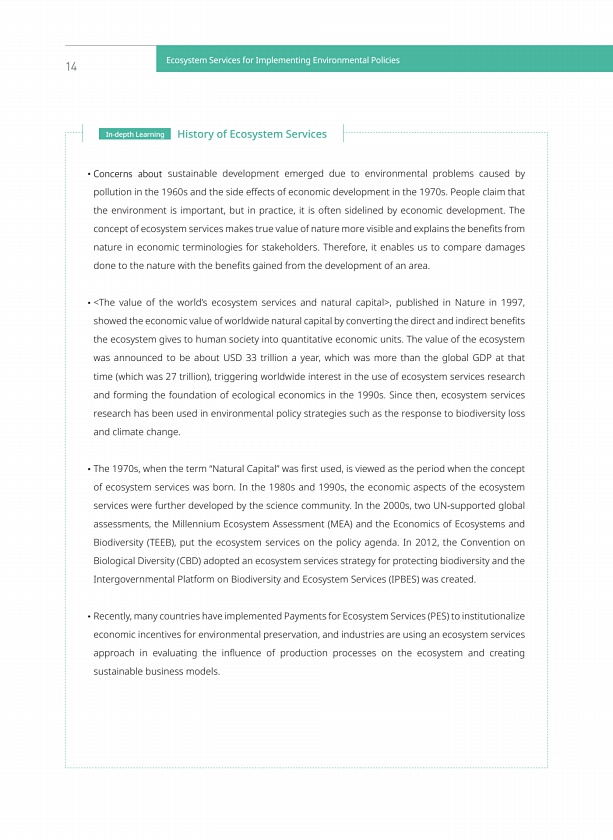 73 곤충 26종 물장군 Ⅱ급 소똥구리 Ⅱ급 쌍꼬리부전나비 Ⅱ급 생물정보 바로가기 생물정보 바로가기 생물정보 바로가기 부 록5 Learning History of Ecosystem Services ??Concerns about sustainable development emerged due to environmental problems caused by pollution in the 1960s and the side efects of economic development in the 1970s. People claim that the environment is important, but in practice, it is often sidelined by economic development. The conc...