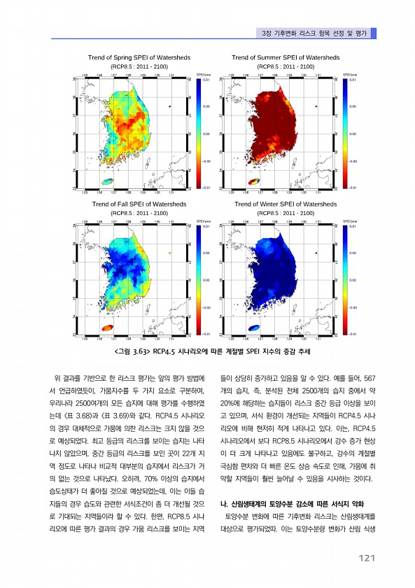 3장 기후변화 리스크 항목 선정 및 평가 121 위 결과를 기반으로 한 리스크 평가는 앞의 평가 방법에 서 언급하였듯이, 가뭄지수를 두 가지 요소로 구분하여, 우리나라 2500여개의 모든 습지에 대해 평가를 수행하였 는데 표 3.68 과 표 3.69 와 같다. RCP4.5 시나리오 의 경우 대체적으로 가뭄에 의한 리스크는 크지 않을 것으 로 예상되었다. 최고 등급의 리스크를 보이는 습지는 나타 나지 않았으며, 중간 등급의 리스크를 보인 곳이 22개 지 역 정도로 나타나 비교적 대부분의 습지에서 리스크가 거 의 없는 것으로 나타났다. 오히려, 70% 이상의 습지에서 습도상태가 더 좋아질 것으로 예상되었는데, 이는 이들 습 지들의 경우 습도와 관련한 서식조건이 좀 더 개선될 것으 로 기대되는 지역들이라 할 수 ...