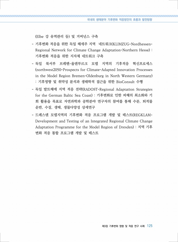 국내외 생태분야 기후변화 적응방안의 흐름과 발전방향 제3장 기후변화 영향 및 적응 연구 사례 125 Elbe 강 유역관리 등 및 거버넌스 구축 기후변화 적응을 위한 독일 헤세주 지역 네트워크 KLIMZUG-NordhessenRegional Network for Climate Change Adaptation-Northern Hesse 기후변화 적응을 위한 지자체 네트워크 구축 독일 북서부 브레멘-올덴부르크 모델 지역의 기후적응 혁신프로세스 northwest2050-Prospects for Climate-Adapted Innovation Processes in the Model Region Bremen-Oldenburg in North Western Germany 기후영향 및 취약성 분석과 생태학적 접근을 위한...