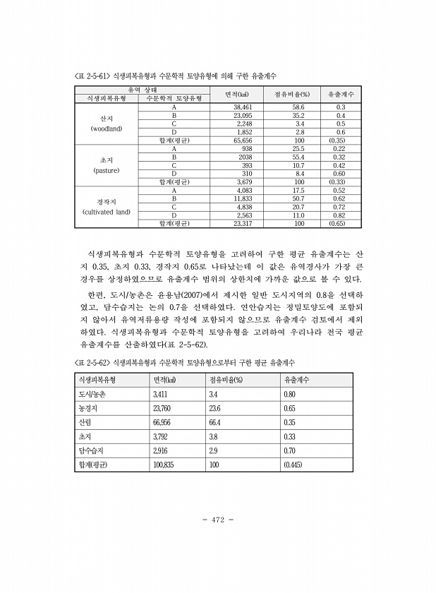 472 유역 상태 면적 ㎢ 점유비율 % 유출계수 식생피복유형 수문학적 토양유형 산지 woodland A 38,461 58.6 0.3 B 23,095 35.2 0.4 C 2,248 3.4 0.5 D 1,852 2.8 0.6 합계 평균 65,656 100 0.35 초지 pasture A 938 25.5 0.22 B 2038 55.4 0.32 C 393 10.7 0.42 D 310 8.4 0.60 합계 평균 3,679 100 0.33 경작지 cultivated land A 4,083 17.5 0.52 B 11,833 50.7 0.62 C 4,838 20.7 0.72 D 2,563 11.0 0.82 합계 평균 23,317 100 0.65 표 2-5-61 식생피복유형과 수문학적 토양유형에 의해 구한 유출계수 식생피복...