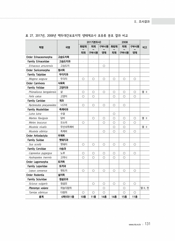 Ⅱ. 조사결과 www.nie.re.kr ? 131 학명 국명 2017 본조사 2008 화방재 비고 ∼ 피재 피재 ∼ 구부시령 구부시령 ∼ 댓재 화방재 ∼ 피재 피재 ∼ 구부시령 구부시령 ∼ 댓재 Order Erinaceomorpha 고슴도치목 Family Erinaceidae 고슴도치과 Erinaceus amurensis 고슴도치 ○ Order Soricomorpha 첨서목 Family Talpidae 두더지과 Mogera wogura 두더지 ○ ○ ○ ○ ○ ○ Order Carnivora 식육목 Family Felidae 고양이과 Prionailurus bengalensis 삵 ○ ○ ○ ○ ○ ○ 멸 Ⅱ Felis catus 고양이 ○ ○ ○ ○ ○ Family Canidae 개과 Nyctereutes...