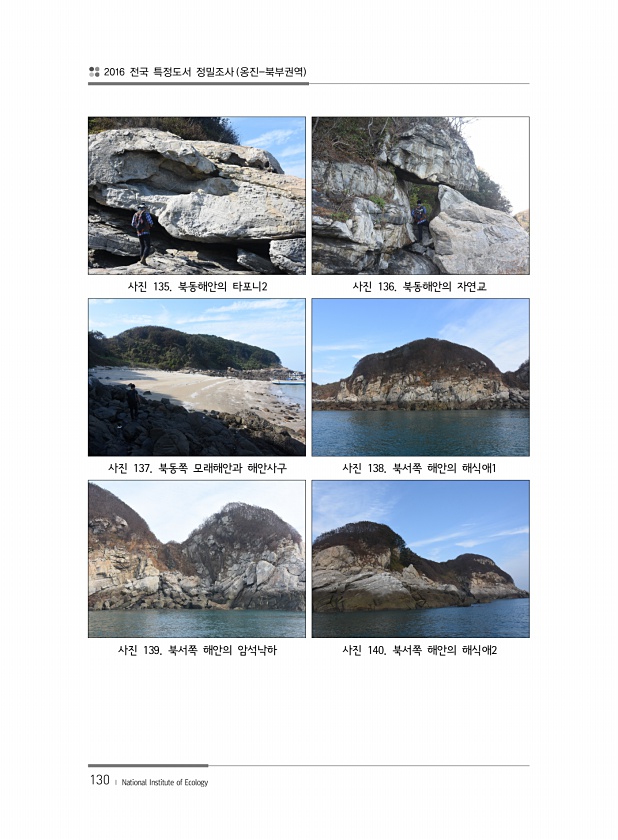 2016 전국 특정도서 정밀조사 옹진-북부권역 130 ? National Institute of Ecology 사진 135. 북동해안의 타포니2 사진 136. 북동해안의 자연교 사진 137. 북동쪽 모래해안과 해안사구 사진 138. 북서쪽 해안의 해식애1 사진 139. 북서쪽 해안의 암석낙하 사진 140. 북서쪽 해안의해식애2
