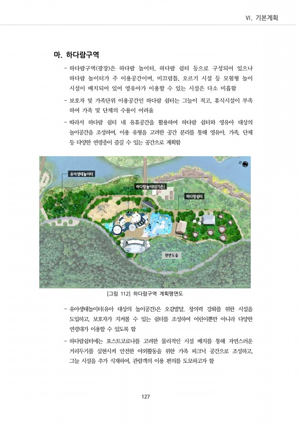 Ⅵ. 기본계획 127 마. 하다람구역 하다람구역 광장 은 하다람 놀이터, 하다람 쉼터 등으로 구성되어 있으나 하다람 놀이터가 주 이용공간이며, 미끄럼틀, 오르기 시설 등 모험형 놀이 시설이 배치되어 있어 영유아가 이용할 수 있는 시설은 다소 미흡함 보호자 및 가족단위 이용공간인 하다람 쉼터는 그늘이 적고, 휴식시설이 부족 하여 가족 및 단체의 수용이 어려움 따라서 하다람 쉼터 내 유휴공간을 활용하여 하다람 쉼터와 영유아 대상의 놀이공간을 조성하여, 이용 유형을 고려한 공간 분리를 통해 영유아, 가족, 단체 등 다양한 연령층이 즐길 수 있는 공간으로 계획함 [그림 112] 하다람구역 계획평면도 유아생태놀이터 유아 대상의 놀이공간 은 오감발달, 창의력 강화를 위한 시설을 도입하고, 보호자가 지켜볼 수 있는 쉼터...